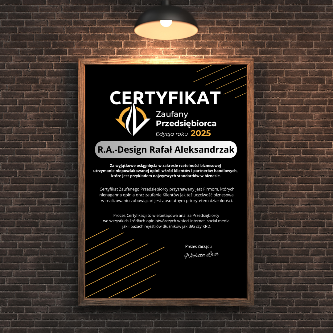 - Elegancki Certyfikat: W języku polskim i angielskim z unikatowym hologramem autentyczności, potwierdzający Twoją przynależność do grona Zaufanych Przedsiębiorców. To dokument świadczący o wiarygodności Twojej firmy wersja elektroniczna do wydruku cyfrowego oraz wykorzystania w Social Marketingu.