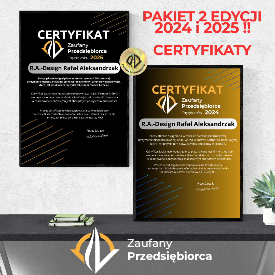 Możesz zamówić same CERTYFIKATY 2024 i 2025 z hologramem autentyczności w wersji elektronicznej do wykorzystania w Twoich Social Mediach, Stronie www oraz druga wersja w formie elektronicznej ze spadami do profesjonalnego wydruku cyfrowego.